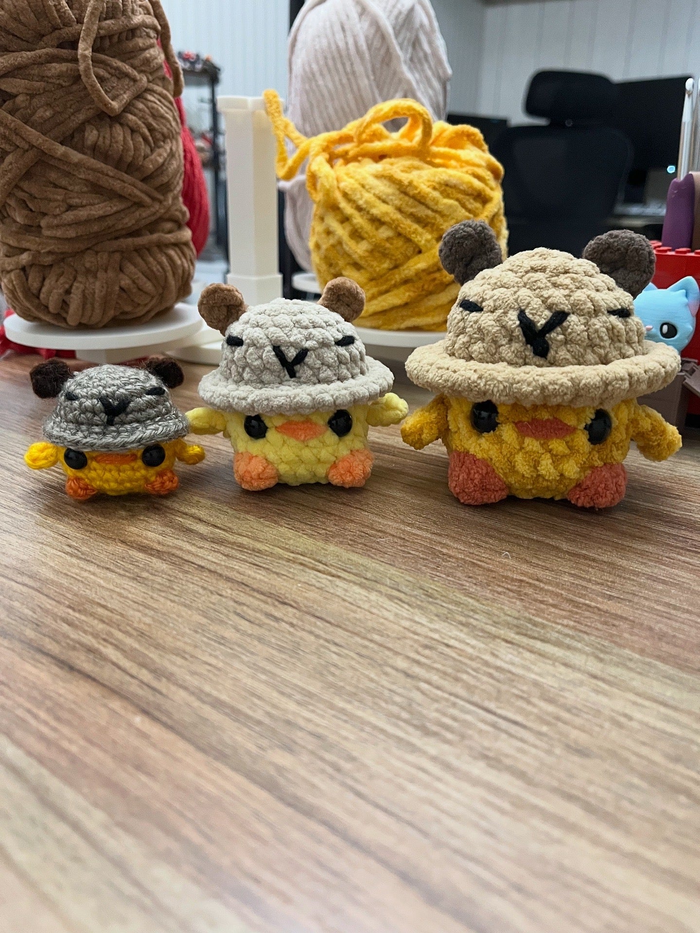 Handmade Crocheted Chicks in Capybara Hats; x-small regular worsted yarn, small plush yarn, and medium blanket yarn versions