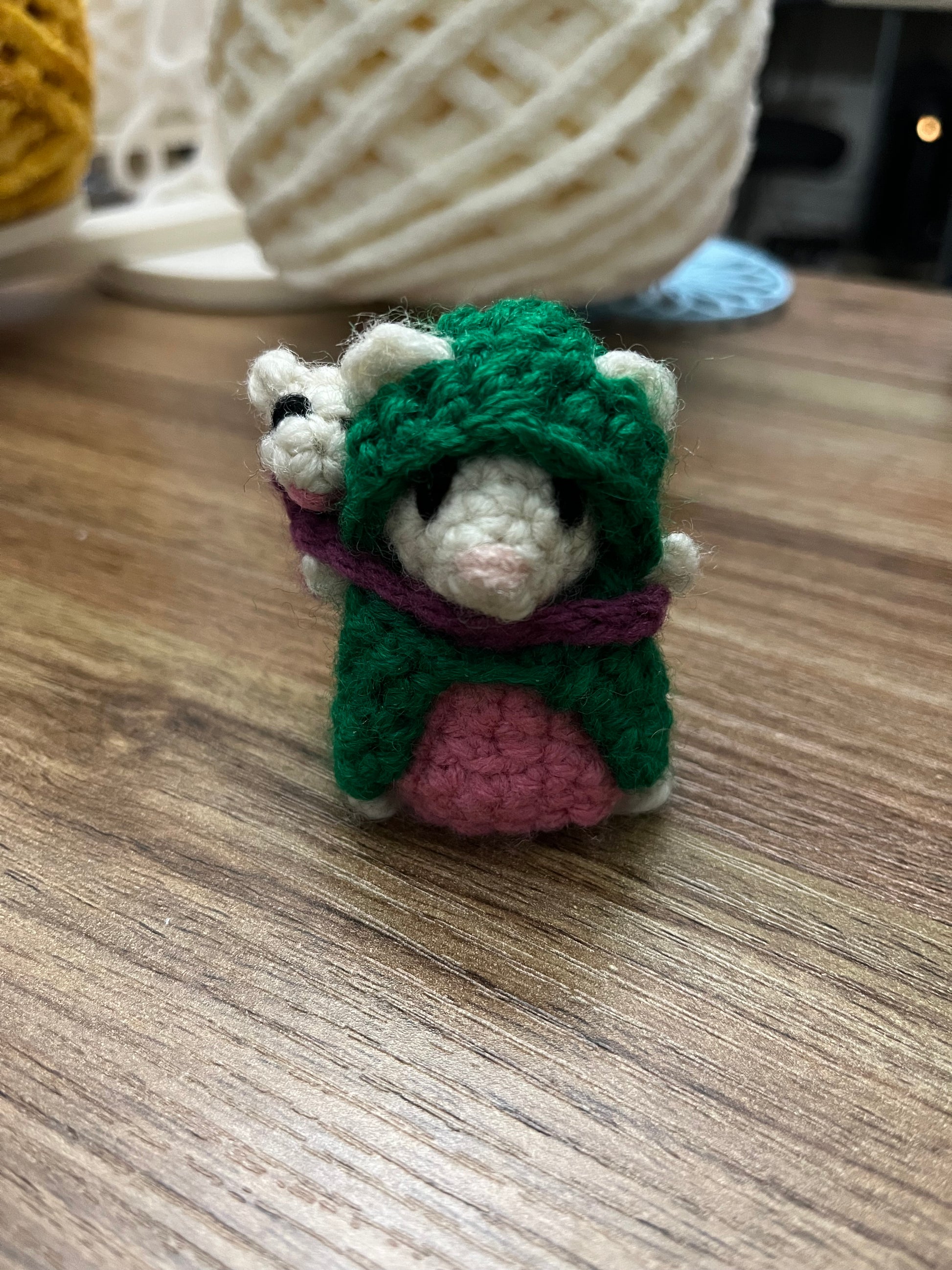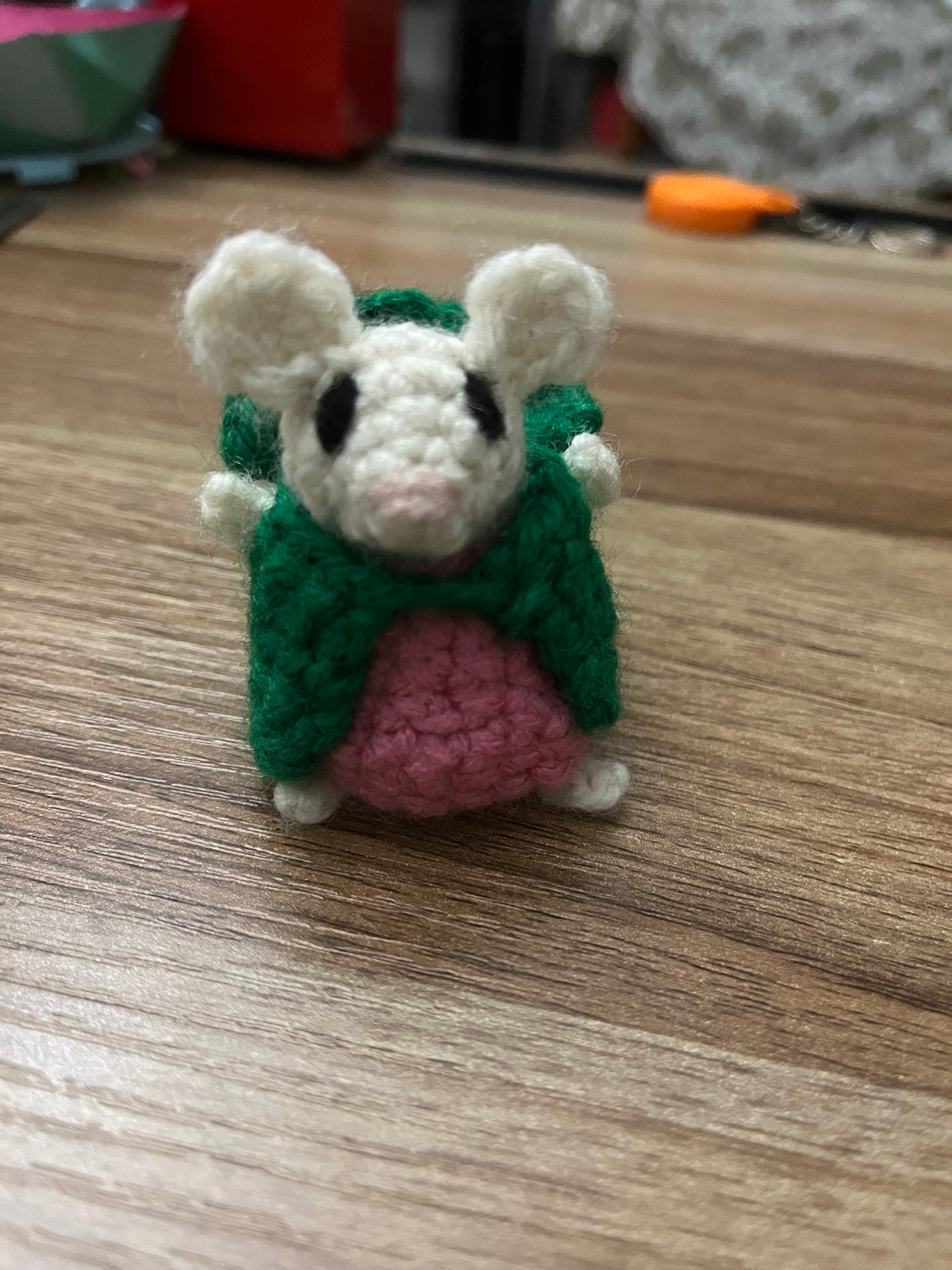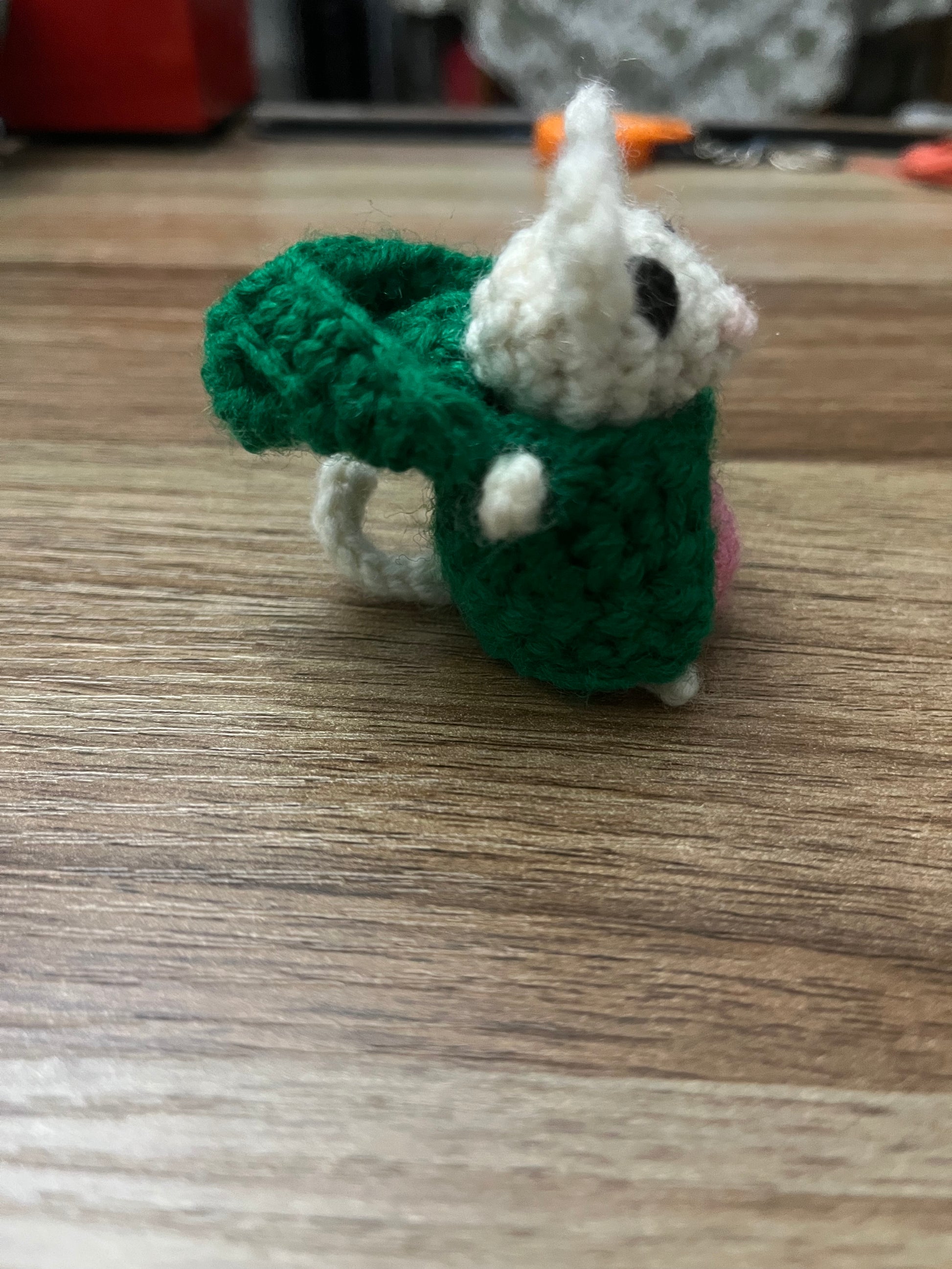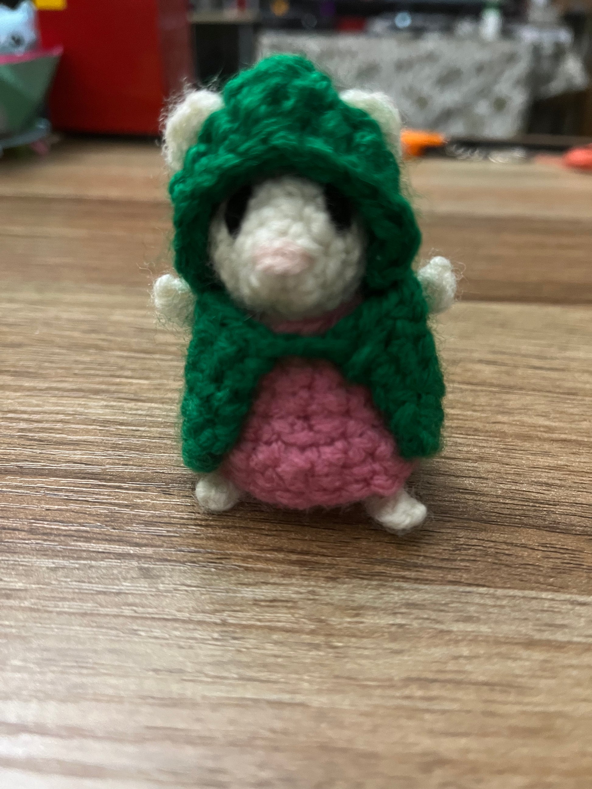 Handmade crocheted cute little whimsical mice. Winnie Foxglove with her adorable cloak and dress and her sweet baby, Adler in a baby sling.